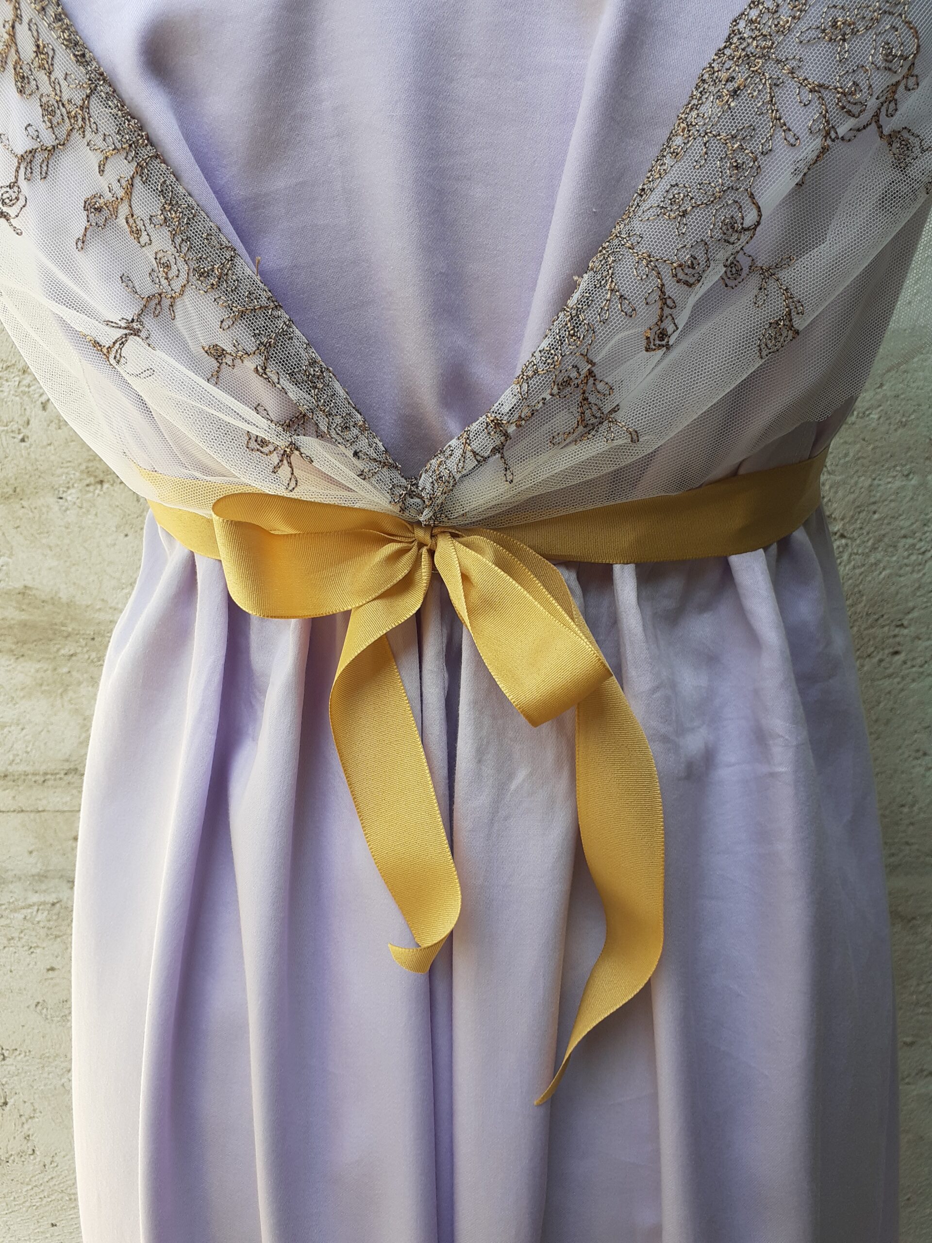 Materiál: 100% bavlněný satén, syntetická vyšívaná krajka na tylu, saténová stuha, lurexová kroucená šňůra