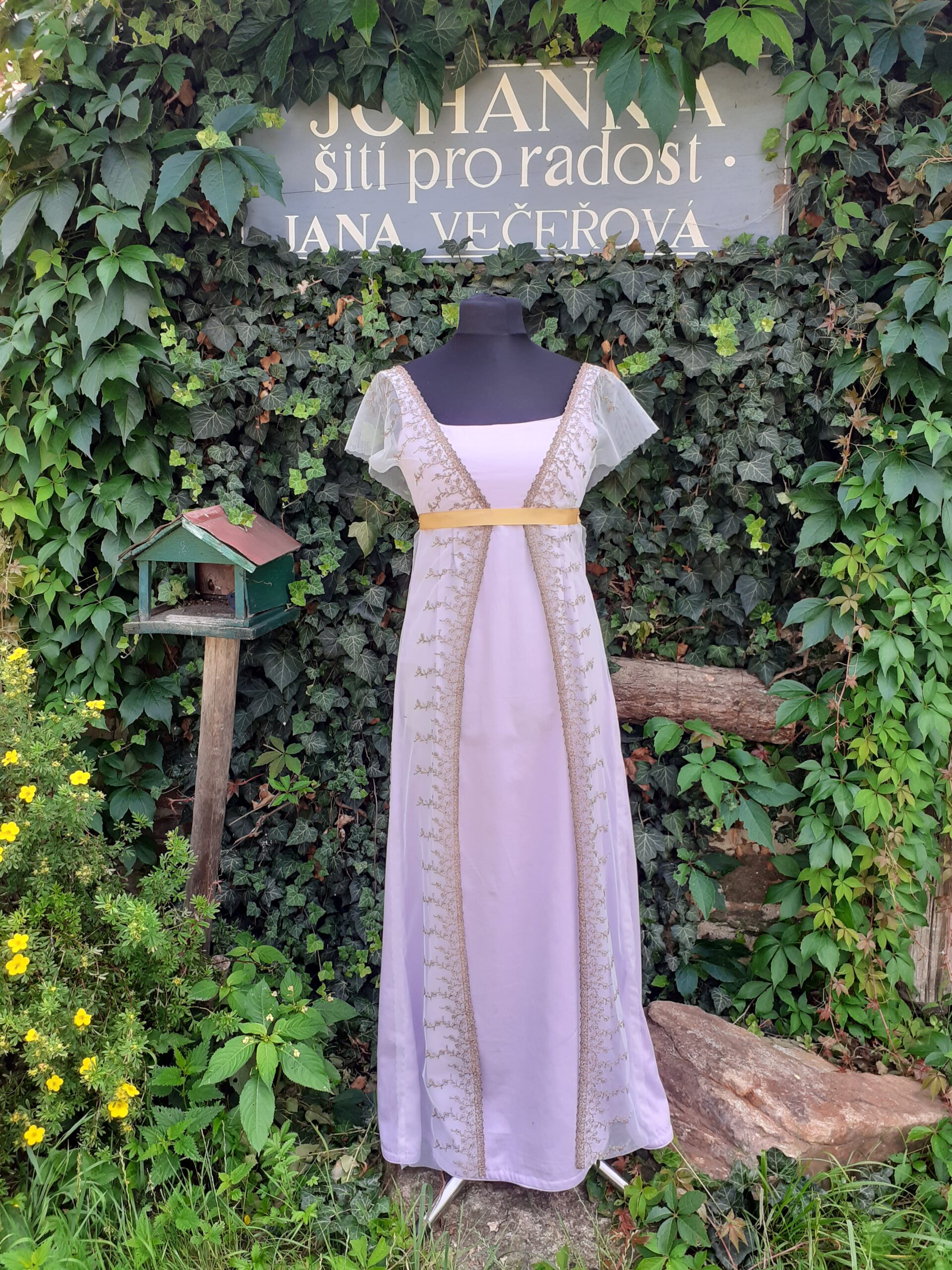 Chystáte se na empírový ples a nevíte co na sebe? Nabízím tyto empírové šaty zdobené vyšívanou krajkou.