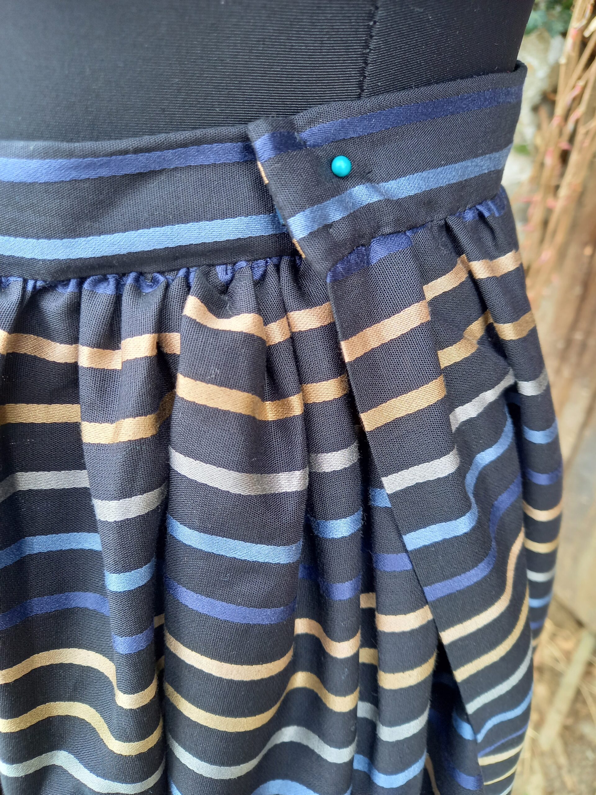 Tato horácká krojová sukně je ušitá z bavlněné košiloviny, je lehoučká jak dech. Sukně je v přední části pouze lehce navolněná do pásku, kdežto na bocích a v zadní části je seskládaná v droboučké sklady, které nádherně nařasí sukni. Sklady jsou prošívané ručně lněnou nití, která v ušité sukni zůstává a pomáhá ji držet ve správném tvaru. Spodní okraj sukně je založen a prošit skrytým stehem. Rozparek v pravém předním kraji je se zapínáním na kovový háček a očko. Sukně je ušita v délce lehce pod kolena, na přání lze samozřejmě ušít délky i jiné.
